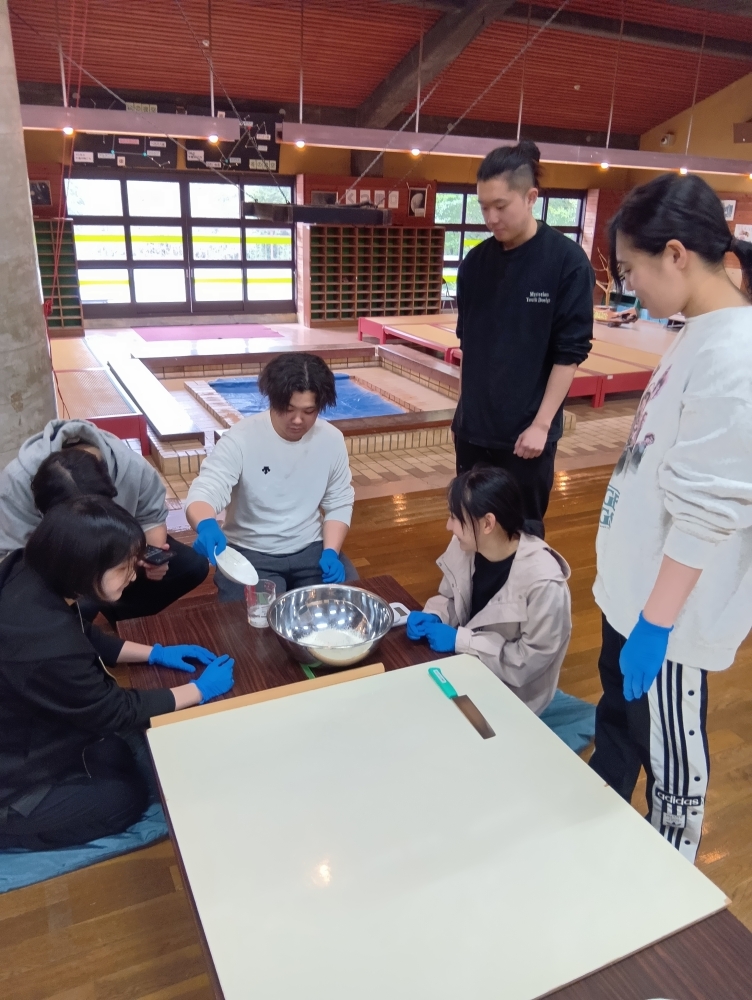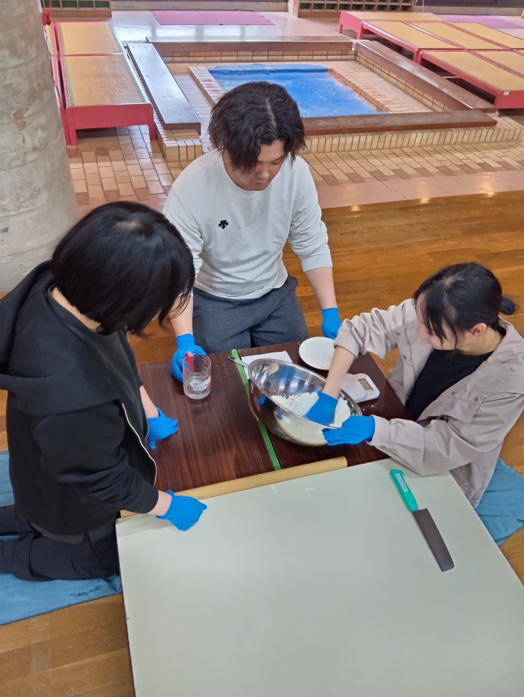 製麺に携わっている職員の参加もあり、アドバイスを受けながらみんなで試行錯誤しながら打ちます。