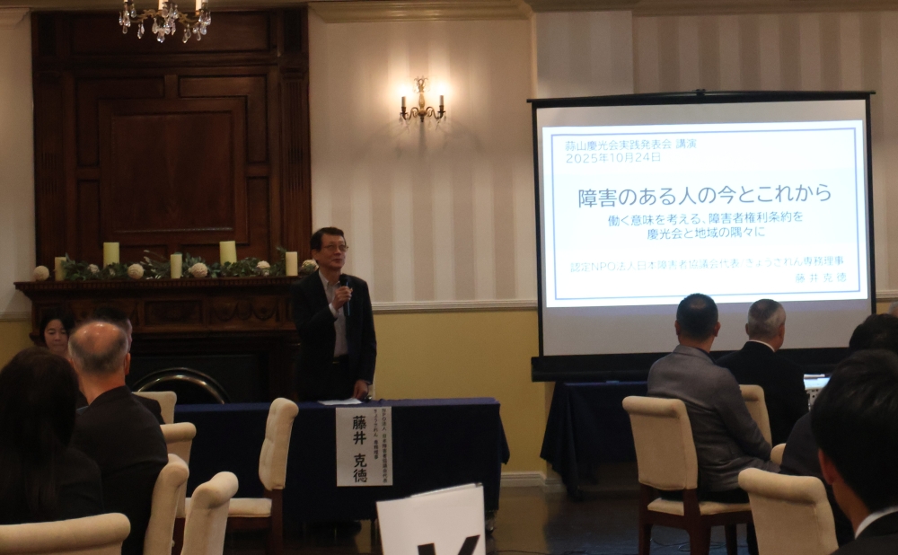 今回は、きょうされん専務理事の藤井克徳様に「障害のある人の今とこれから~働く意味を考える、障害者権利条約を慶光会と地域の隅々に~」というテーマで特別講演をいただきました。