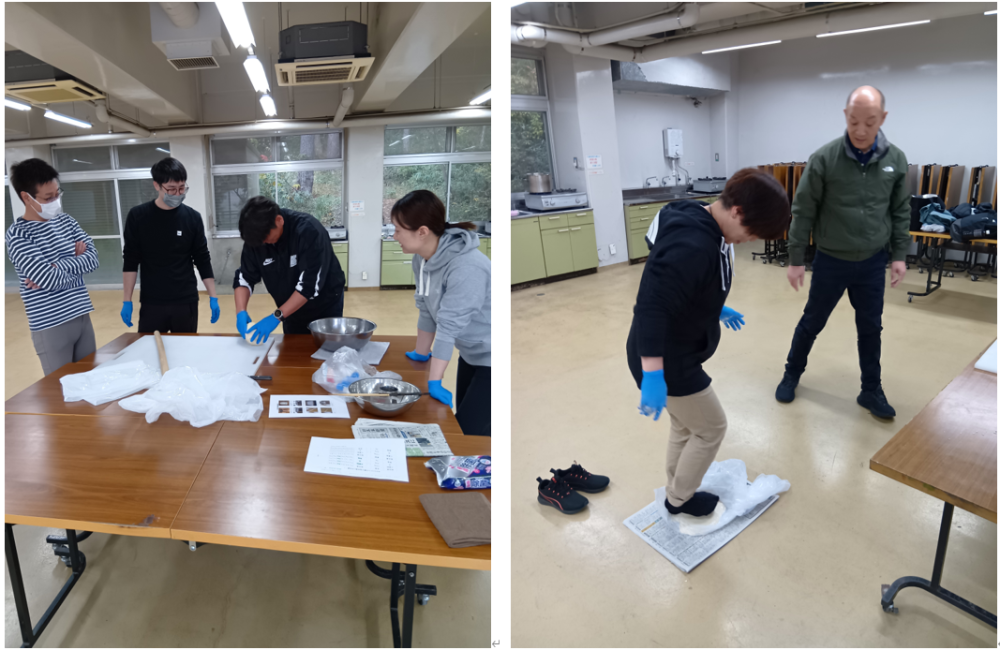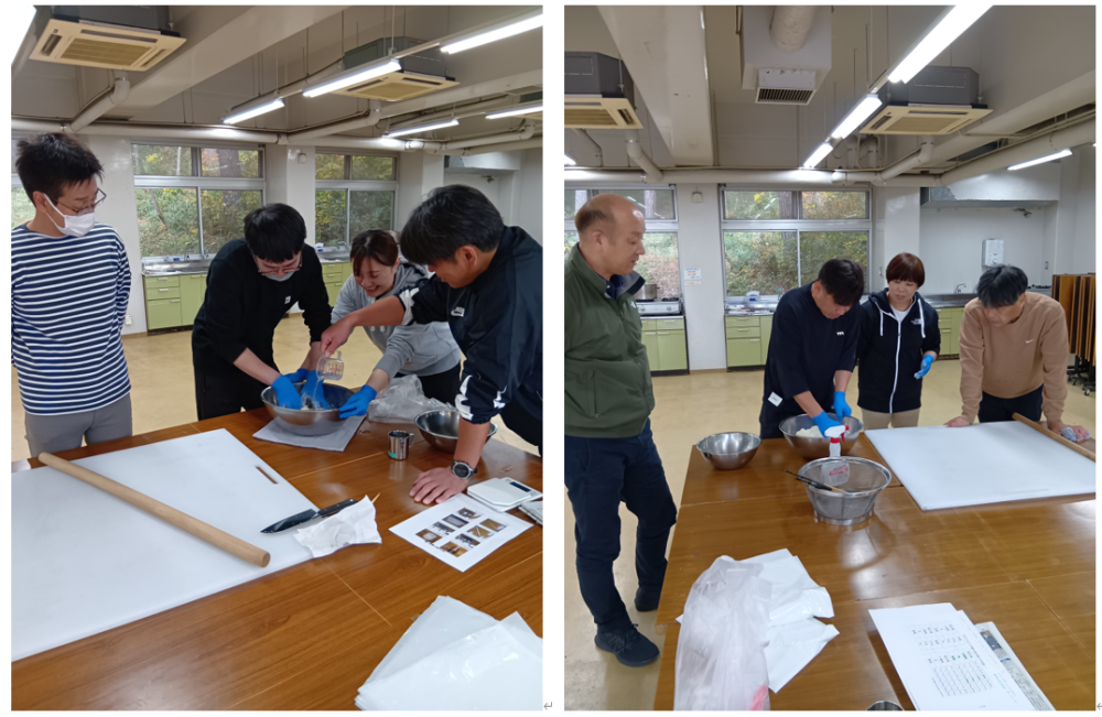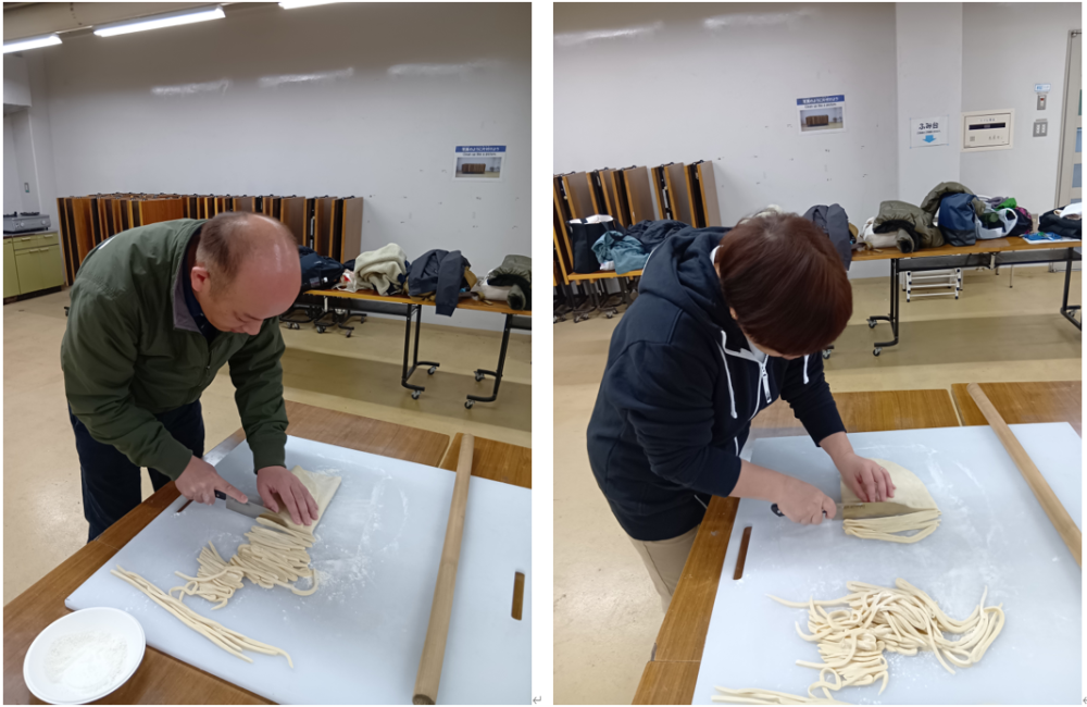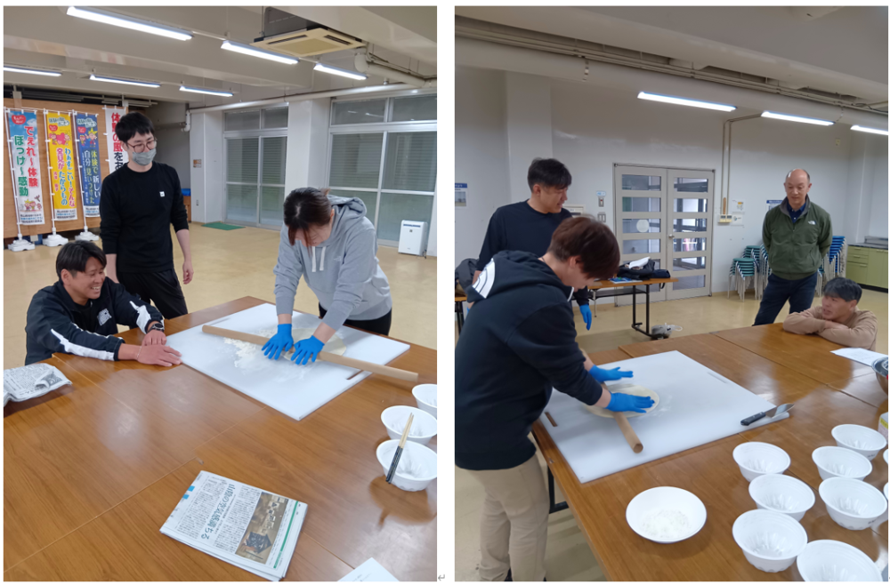 午前中の活動は、手打ちうどん作り。慶光会では製麺屋三座の製麺事業もしていますので、うどんの製麺が得意な方々がいます。そこで、その方々を中心に2チームに分かれてうどんを打っていきます。
