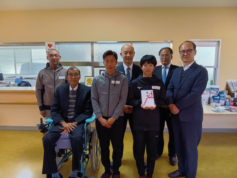 贈呈式には、とりぎんリース株式会社 代表取締役 小野澤様、株式会社鳥取銀行 執行役員 本店営業部長 梅実様にご出席いただき、理事長 柴田、所属選手の川口梨央、大川順一郎、福間釉絆、浅田コーチが出席しました。